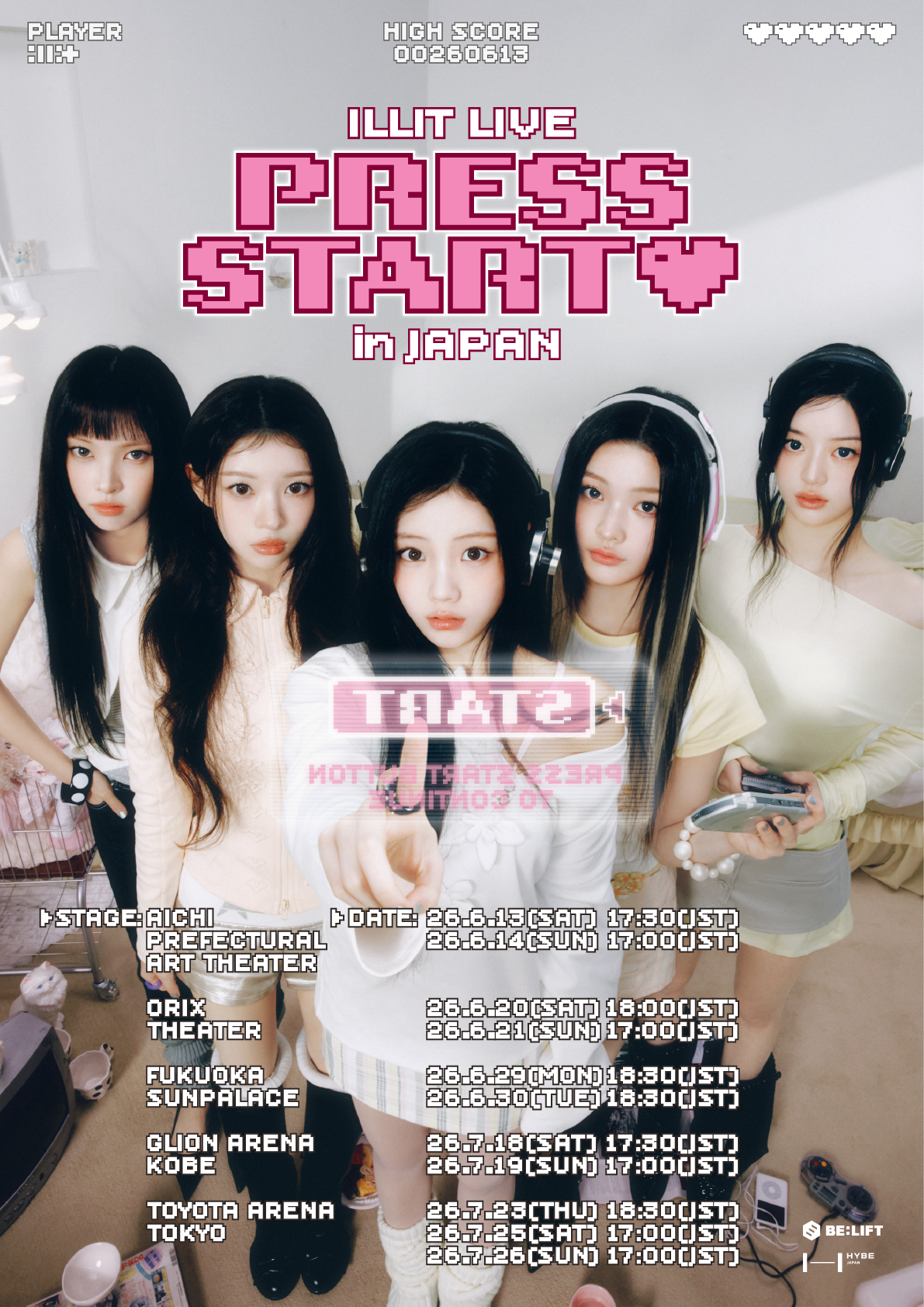 ”K-POP第5世代ガールグループ強者”ILLIT(アイリット)の初のライブツアーの日本公演『ILLIT LIVE 'PRESS START︎❤' in JAPAN』(以下「PRESS START︎」)の詳細が決定しました。6月13日・14日の愛知・愛知県芸術劇場 大ホールを皮切りに、6月20日・21日に大阪・オリックス劇場、6月29日・30日に福岡・福岡サンパレス、7月18日・19日に兵庫・GLION ARENA KOBE、7月23日・25日・26日に東京・TOYOTA ARENA TOKYOで5都市11公演を開催します。愛知・福岡・兵庫・東京での単独公演は初めてとなり、より多くの場所でファンの皆さんとお会いできる公演に多くの期待が寄せられています。