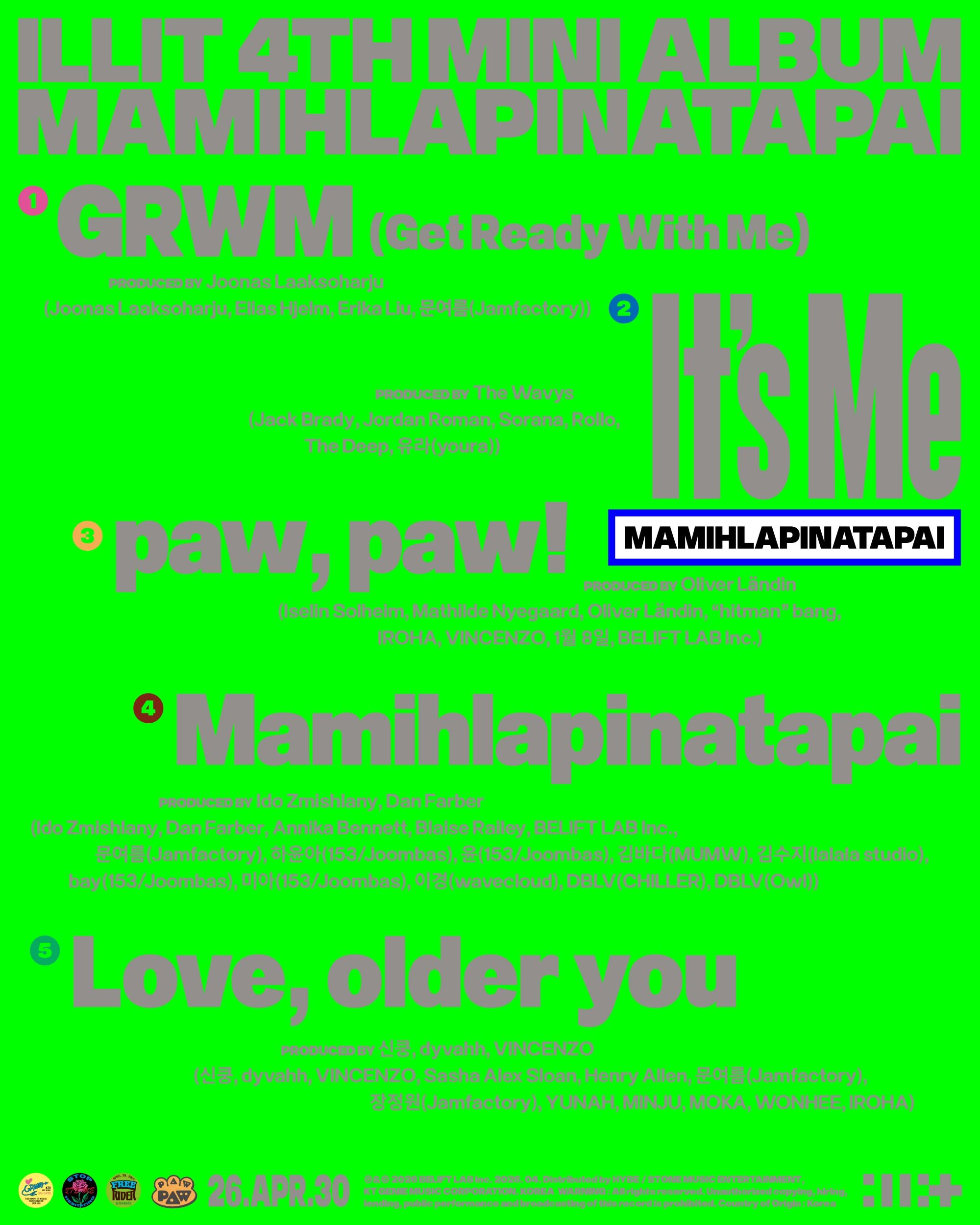 ILLIT(YUNAH、MINJU、MOKA、WONHEE、IROHA)は、3月31日正午にHYBE LABELSの公式YouTubeチャンネルで4th Mini Album ‘MAMIHLAPINATAPAI’ (マミラピナタパイ) のトラックリストを公開した。これによると、本作にはタイトル曲「It’s Me」をはじめ、「GRWM (Get Ready With Me)」、「paw, paw!」、「Mamihlapinatapai」、「Love, older you」の全5曲が収録される。