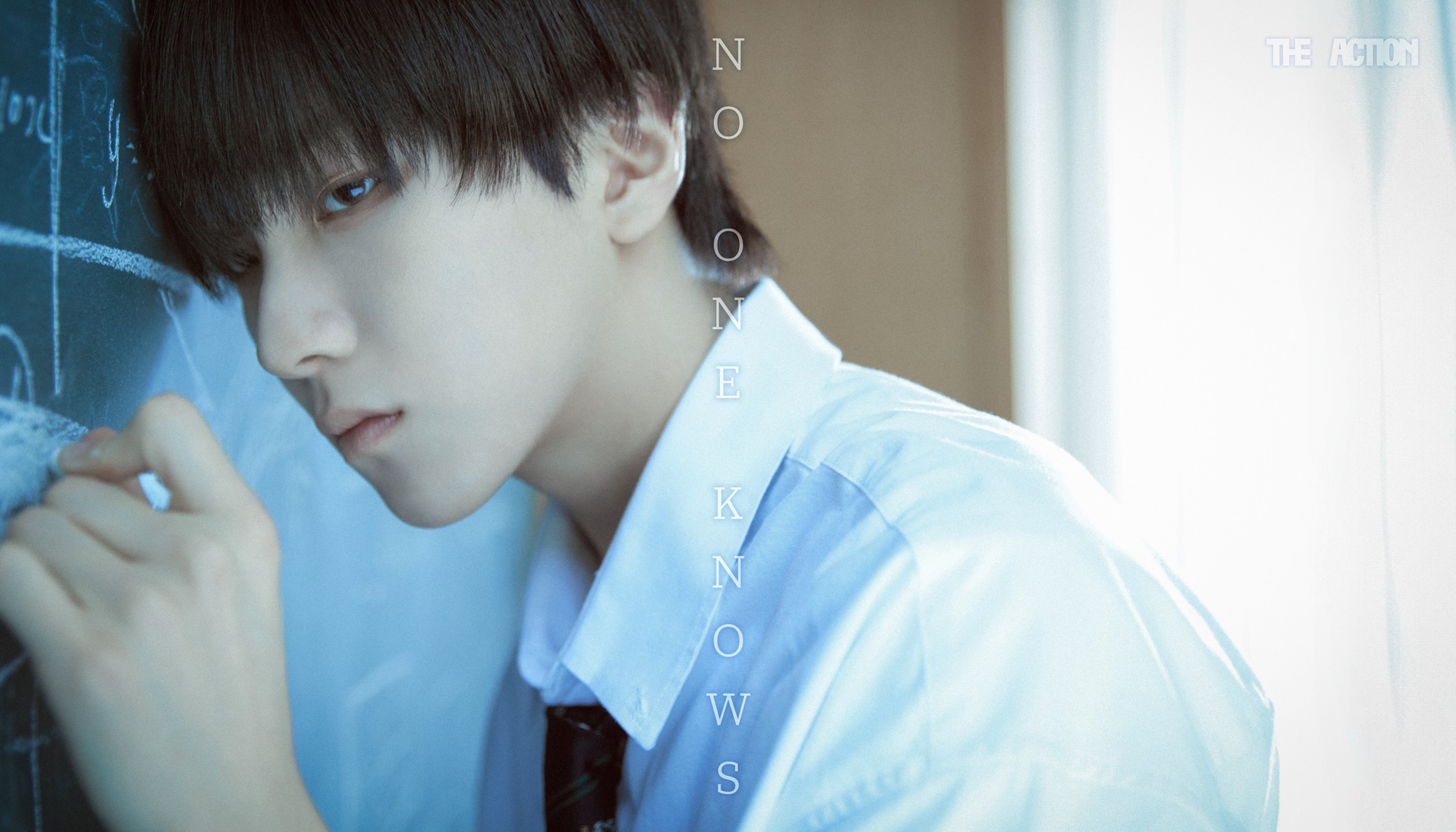 WOONHAKは物静かな高校生になって空虚な感性を表現する。教室に一人残って窓の外を眺める目つきから寂しさがにじみ出る。