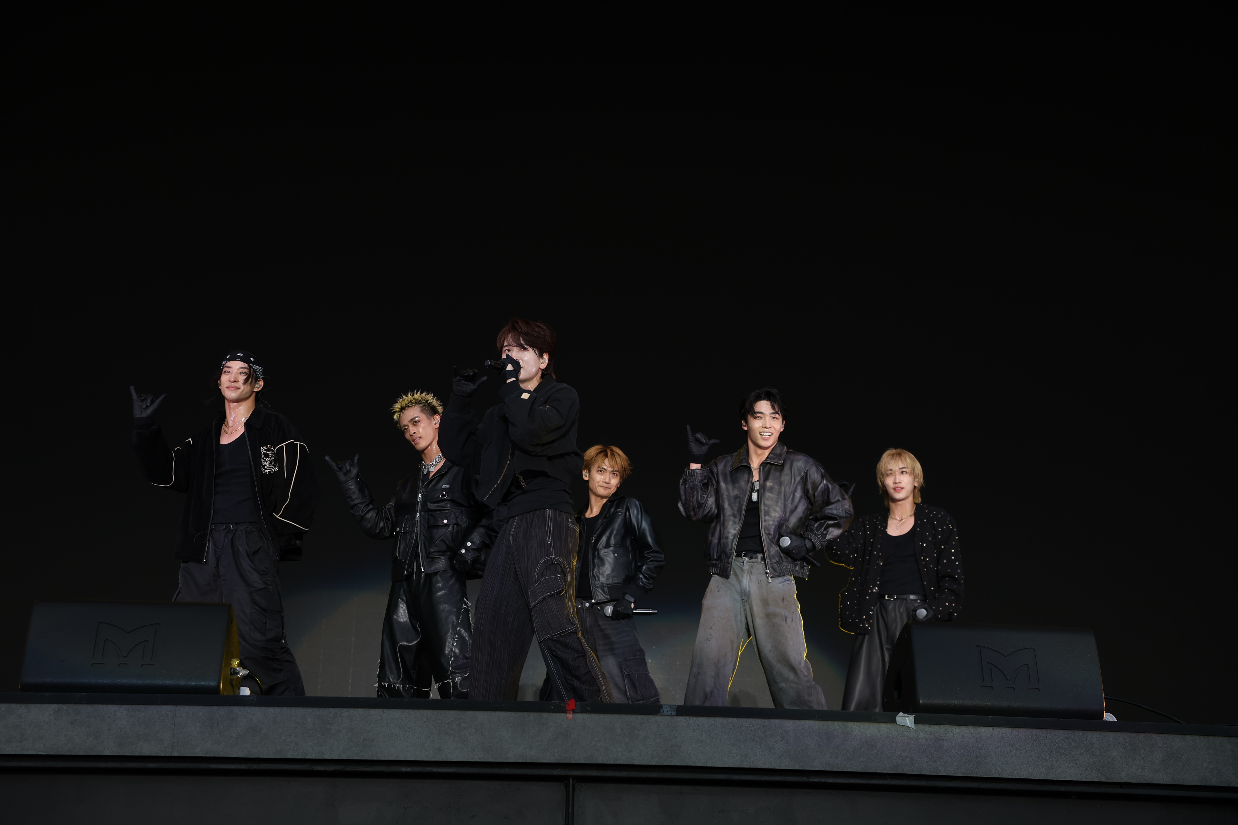 MCでは、メンバーが「大阪アツすぎ!」と観客の熱気に笑顔を見せ、NAOYAは月を見上げながら「月も綺麗ですけど、皆さんも綺麗ですよ!」と語りかけ、会場を和ませました。また、メンバー全員がドリンクボトルを掲げ「乾杯!」の掛け声とともに観客と水分補給を行う場面もあり、会場は温かな空気に包まれました。後半はサマーソング「Seaside Story」で観客を魅了。爽やかなリズムに乗せて、歌い上げる彼らの姿に観客の視線は釘付けになりました。また、大阪・関西万博の夜空に打ち上がる花火と、楽曲中に仕掛けられた花火の演出がシンクロ。会場は感動的な空気に包まれ、大歓声が上がりました。終盤には、和とストリートの要素を掛け合わせた斬新なサウンドの最新曲「DANGER」を披露し、ポッピンやブレイキンなど、メンバーそれぞれの完成度の高いダンスパフォーマンスを繰り広げ、会場は大盛り上がりとなりました。