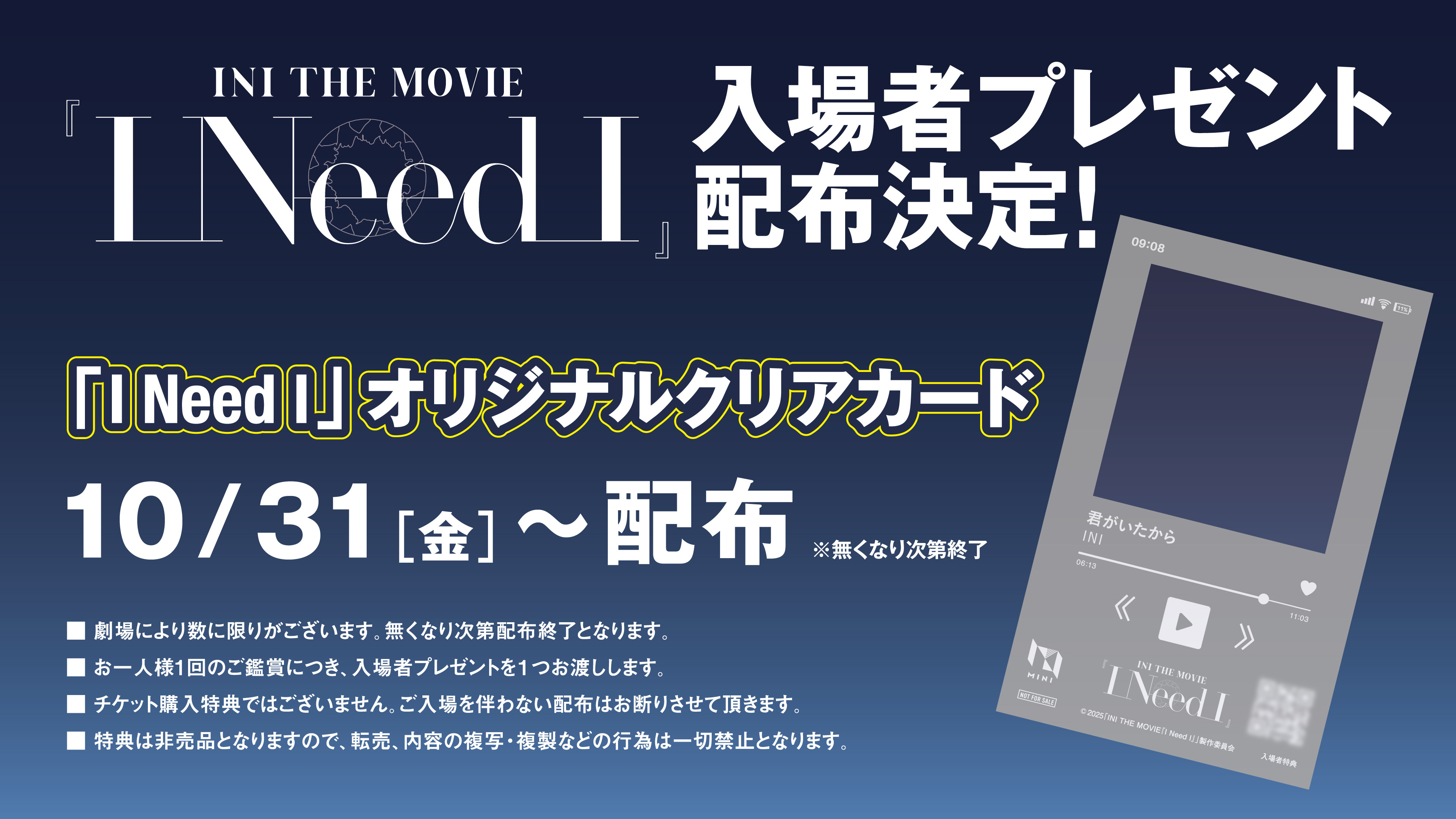 このたび、10月31日(金)に全国公開となるINI初のドキュメンタリー映画「INI THE MOVIE『I Need I』」の公開を記念して、公開日の10月31日(金)より、入場者プレゼント「『I Need I』オリジナルクリアカード」を配布することが決定しました。