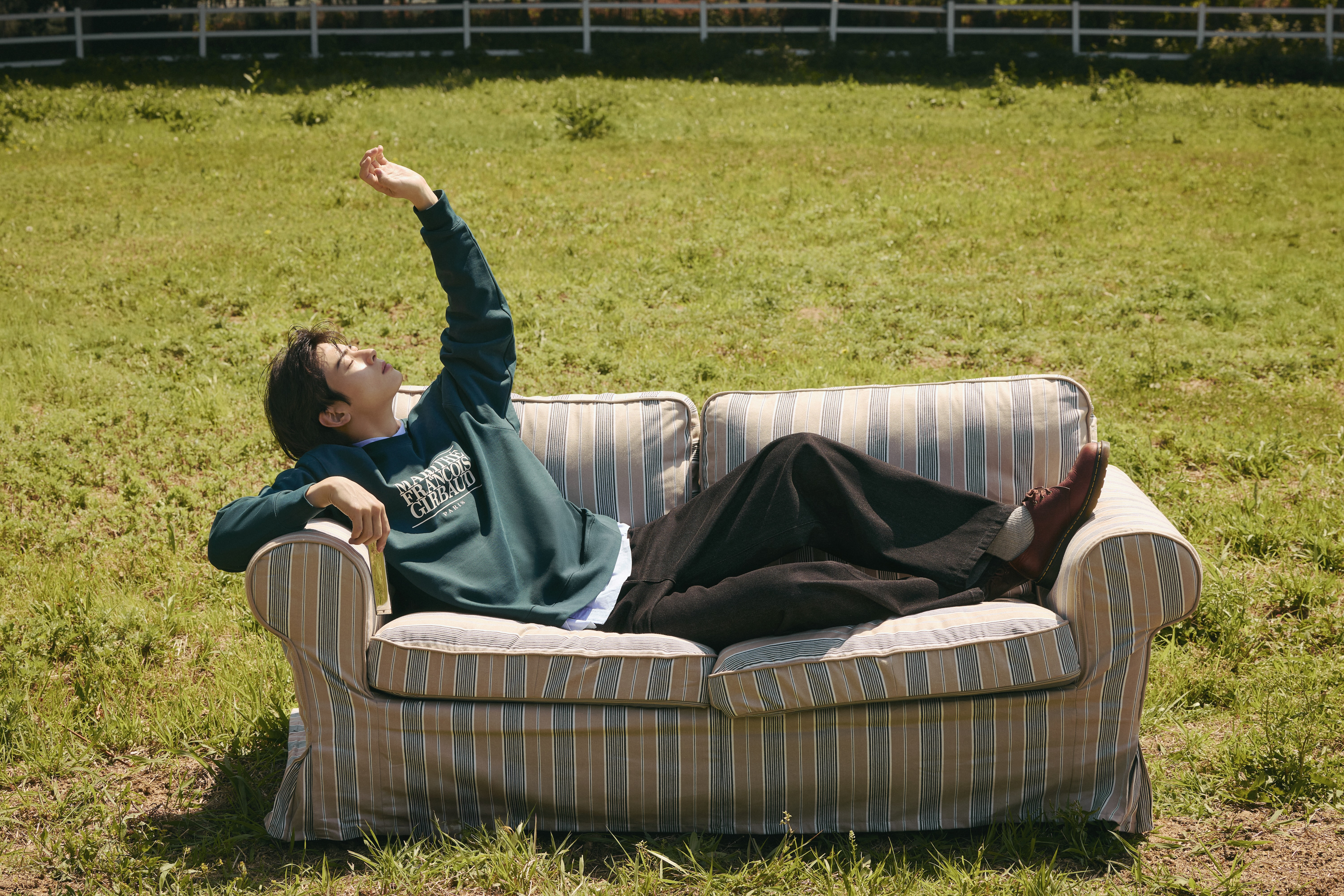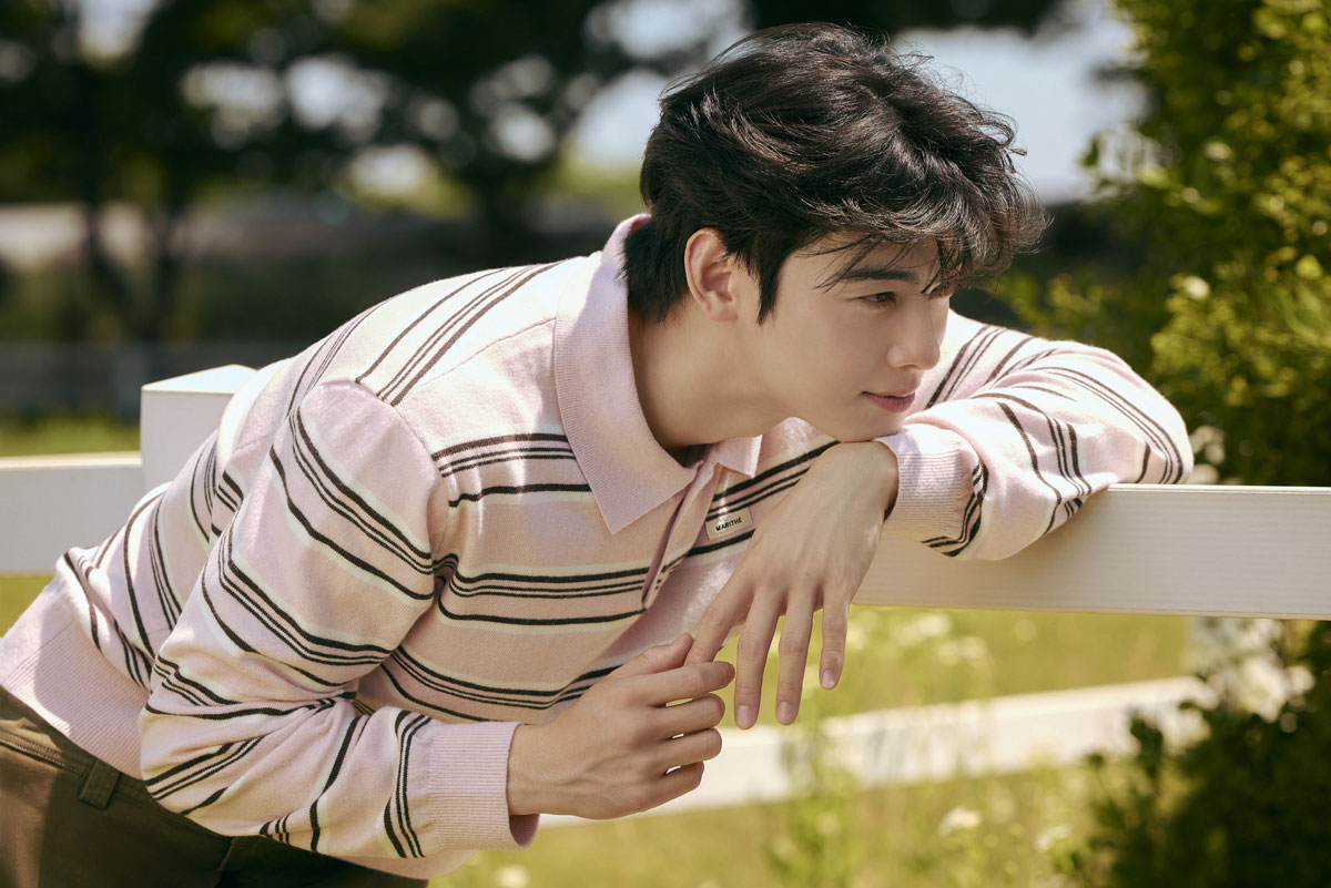 乗馬場を背景に、穏やかな時間を過ごす彼の姿は、完璧なビジュアルケミストリーを生み出し、見る者の視線を釘付けにします。チャウヌは本ビジュアルの中で、完成度の高いシルエットが際立つクラシックロゴデニムブルゾンにリラックス感のあるスウェットパンツを合わせ、また、ピンクカラーのストライプポロニットに自由な印象のカーゴパンツ、そしてバーシティジャケットをレイヤードするなど、洗練されたミックスマッチスタイルを表現しています。