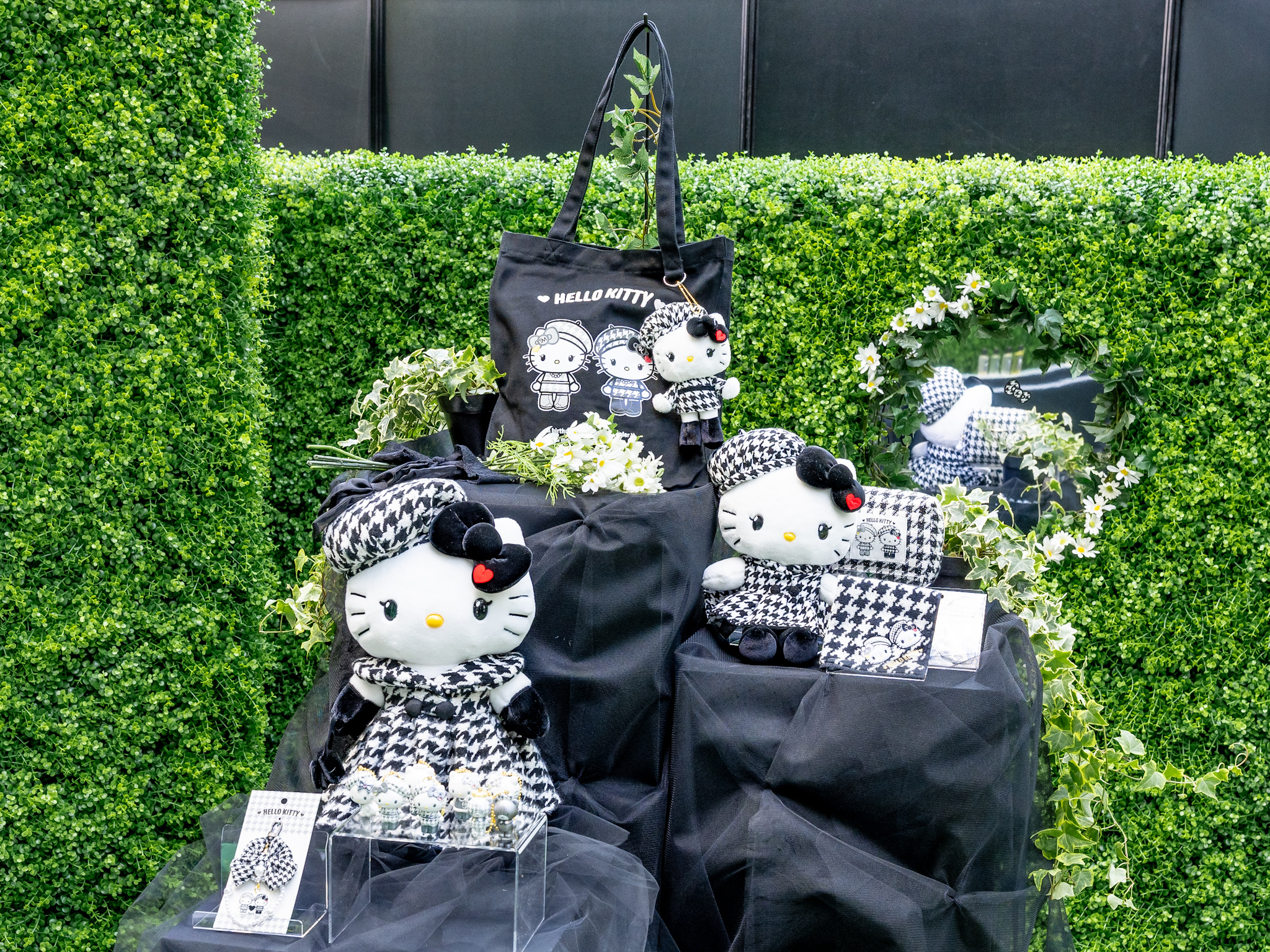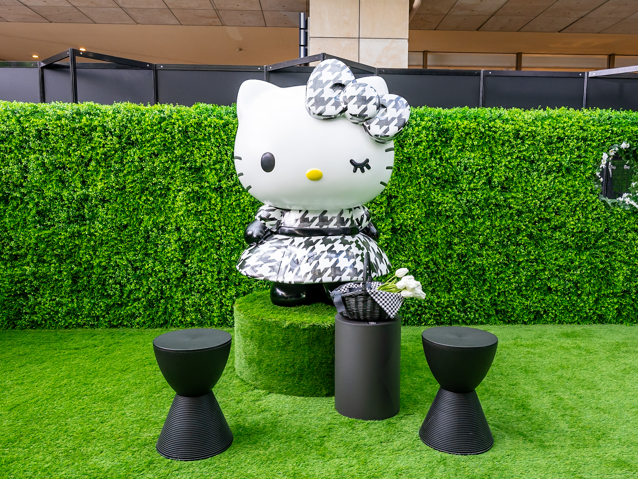 千鳥格子ファッションのハローキティと写真が撮れるスポットも