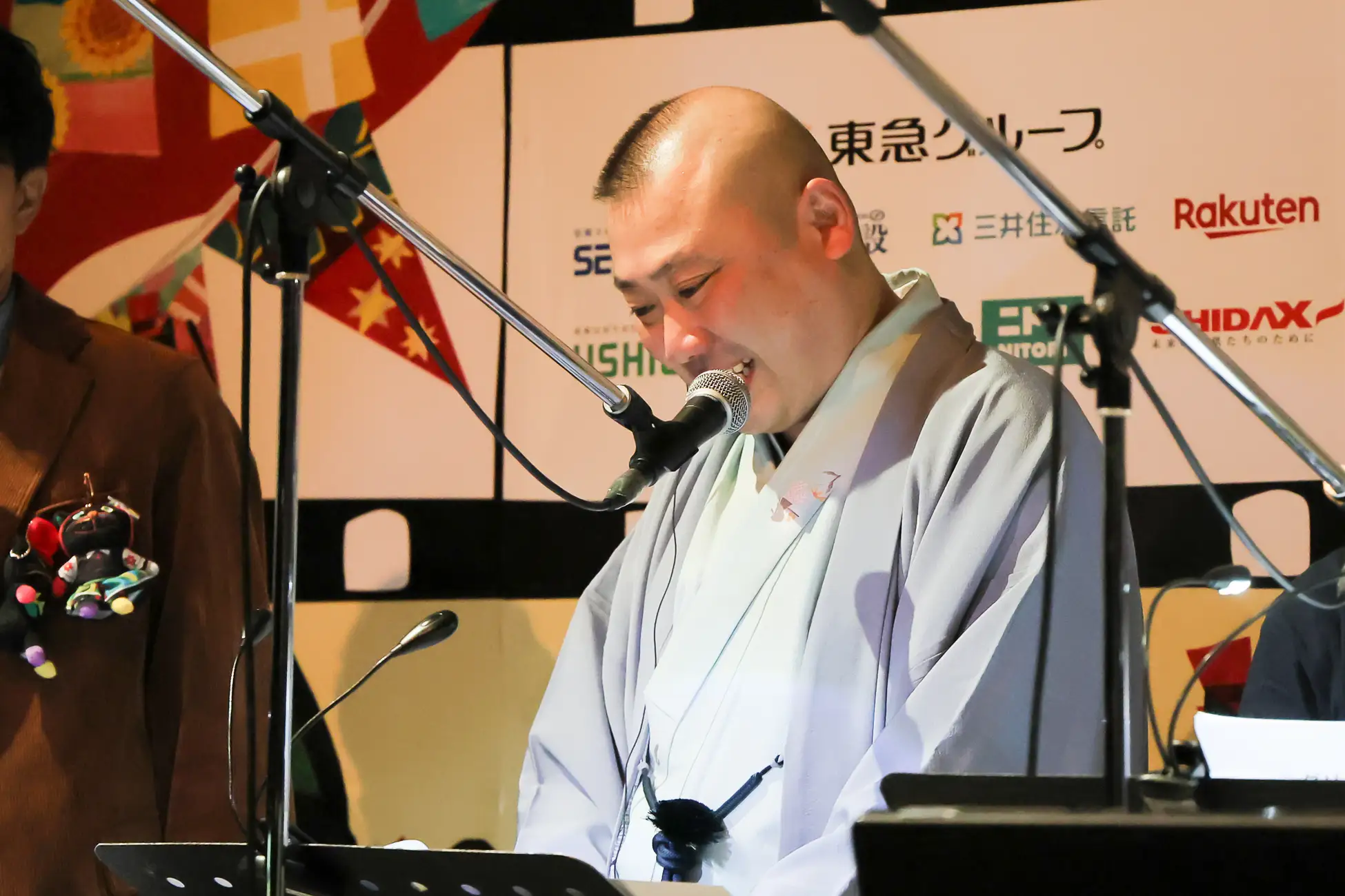 キネコは、ステージ前のマットの上で、寝そべって映画鑑賞している雰囲気が良いですよね。それが映画祭ならではの魅⼒だな、と感じます。キネコ国際映画祭では、毎年⼩噺をやらせていただいているのですが、海外の⽅が⾔葉が通じてなくても⼀緒になって蕎⻨を⾷べる所作のところで笑ってくれたり、動画を撮ってくれたりするので嬉しかったです。それがまた、海外でちょっとでも落語が広がってくれたら映画祭ならではの価値だと思いますね。