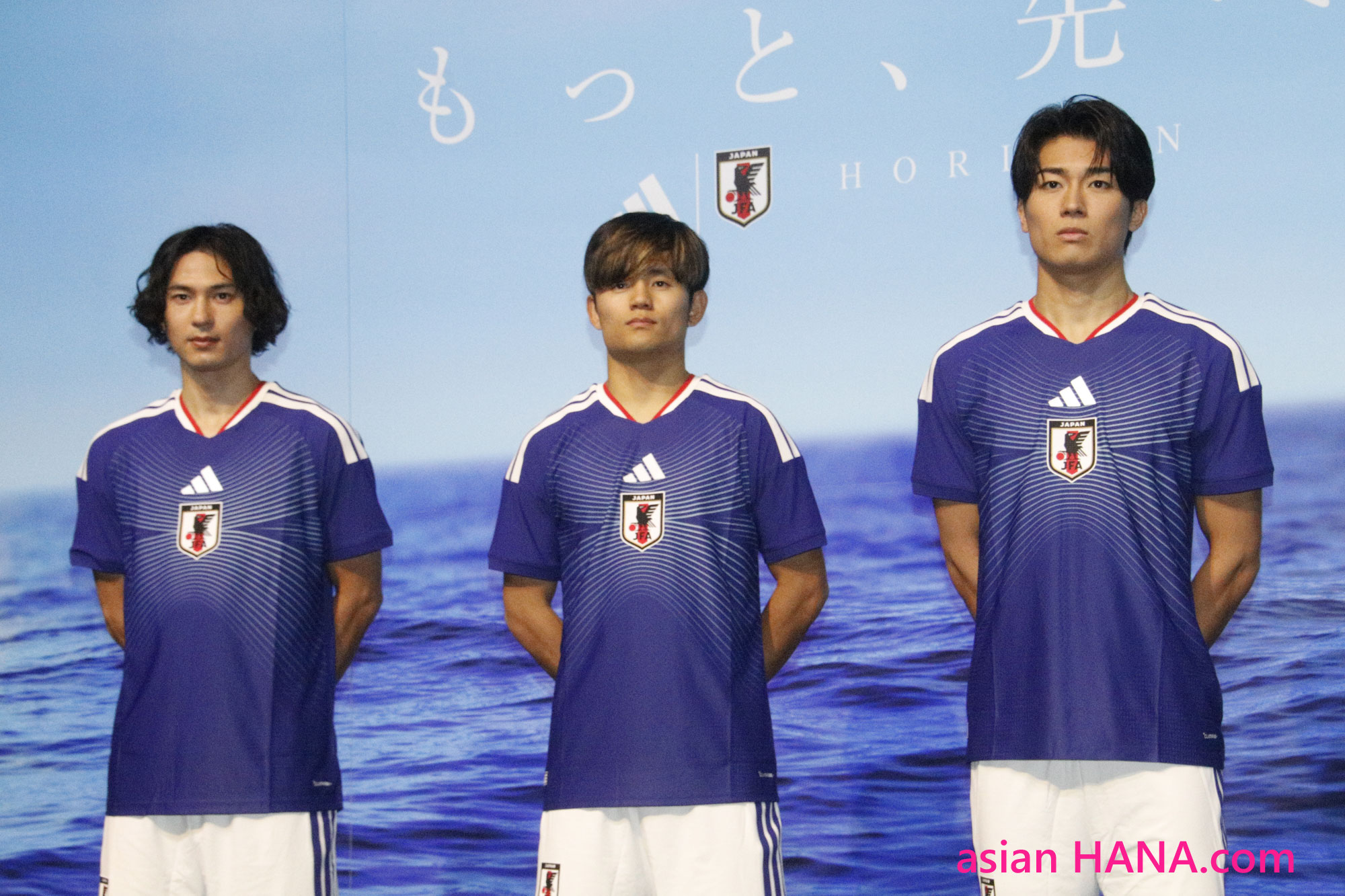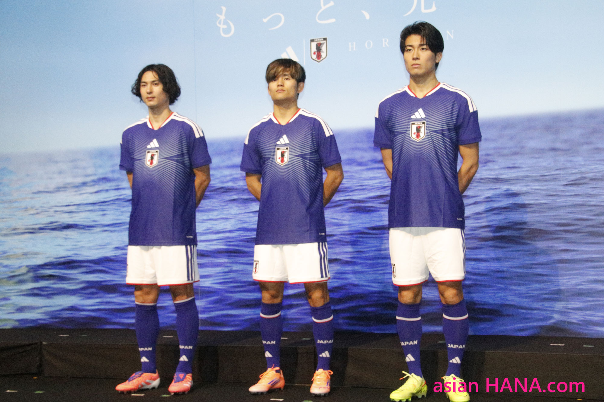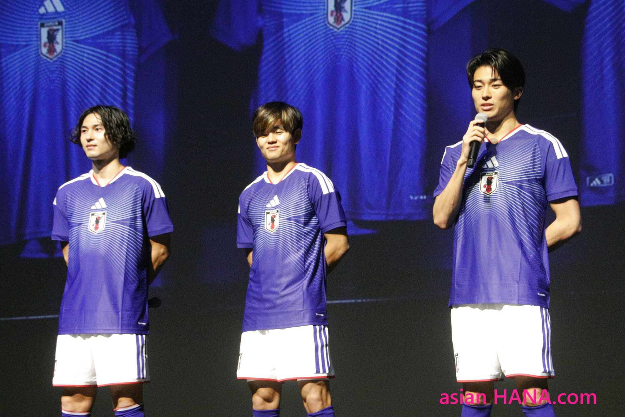 次にSAMURAI BLUEの久保建英選手、南野拓実選手、中村敬斗選手が新ユニフォームで登壇。新しいユニフォームが完成した感想について南野選手は「期待を超えるカッコイイデザインで気に入っています」と笑顔を見せた。久保選手は「水平線というイメージだということで、僕もデザインしてみましたが僕が書いたものより何倍も良くてよかったです」とはにかんだ。中村選手は「僕がデザインしてみたものと似ていて嬉しかったし、アーチになっているとこが気に入っています」と答えた。撮影での感想について南野選手は「気持ちが高まるし、ファッション的にもカッコイイと思います」と回答し、久保選手は「菅原選手が僕の仮面を被ってきたので笑ってしまいました」と撮影秘話を明かした。渋谷に登場した久保選手の巨大モニュメントについて久保選手は「今朝見てきましたが、予想より大きくてびっくりしました。窮屈そうですね」と目をまるくし、中村選手は「いつもの久保選手を知っているので笑っちゃいました」と2人は目を見合わせた。ここで久保選手にミニモニュメントがプレゼントされると久保選手は「本人のビジュアルを超えてる」と言いながらも「家に飾ります」と嬉しそうに受け取った。