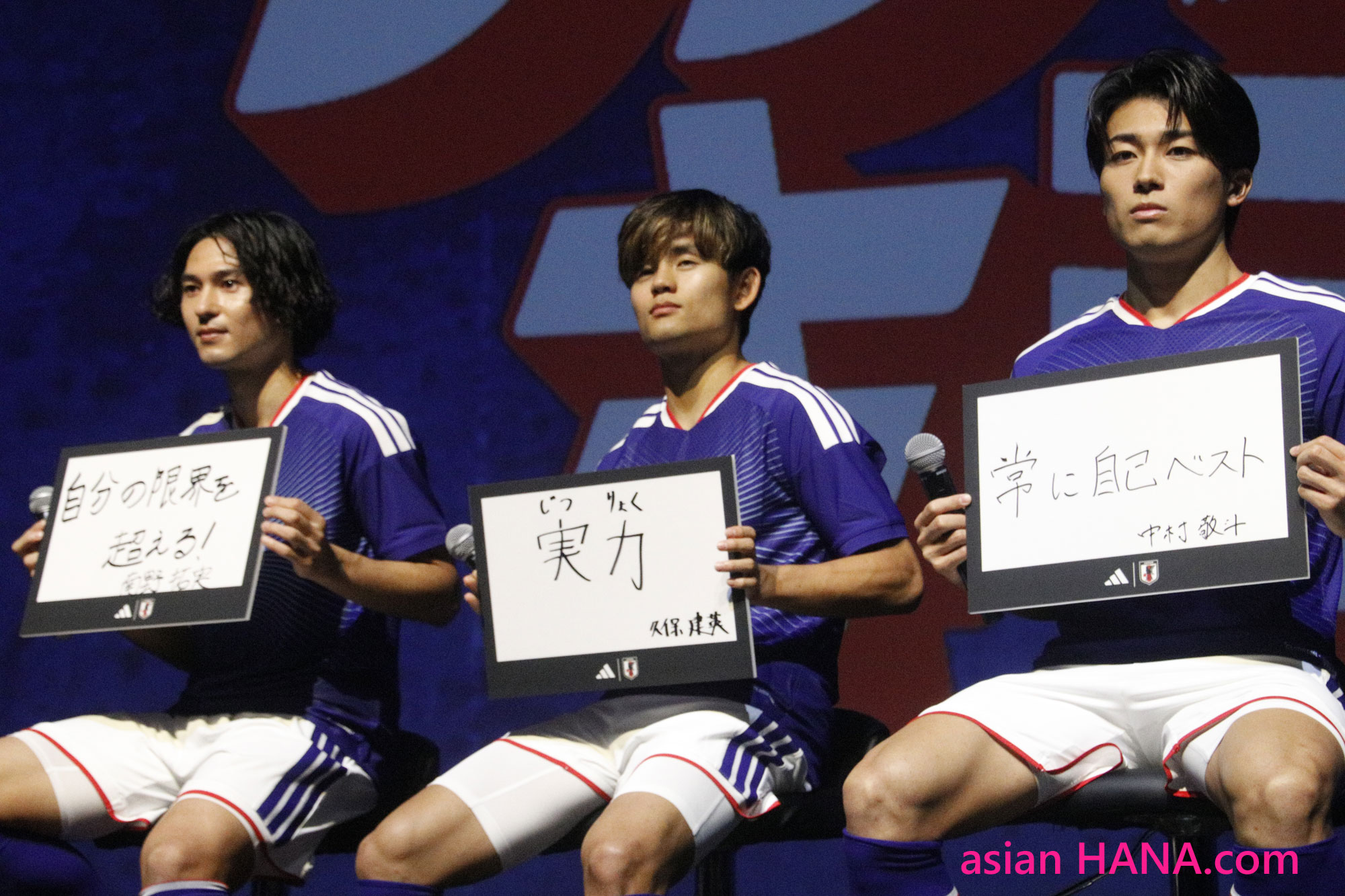 ”日本代表のぞきみ”という企画で、選手達がいろいろなことにチャレンジしたことについて中村選手は「水平線というヒントだけでユニフォームをデザインしてみましたが、良く描けたと思います。70点ぐらいですね」と自己評価し、今後公開されていく企画も楽しみだ。もっと、先へ。行くためには?という質問に南野選手は「自分の限界を超える」、久保選手は「実力」、中村選手は「常に自己ベスト」と意気込みを答えた。
