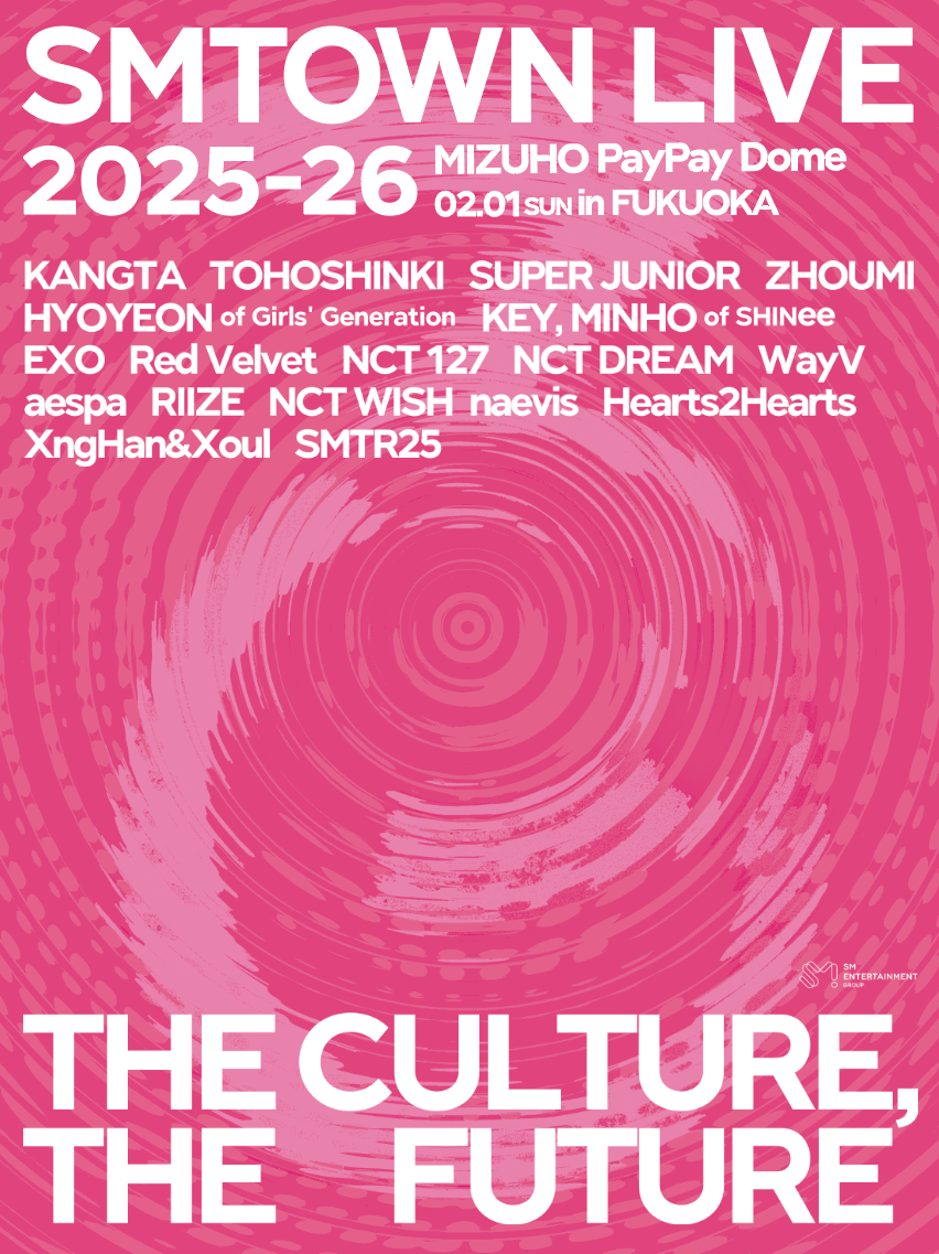 2025年はSMエンターテインメント創立30周年となり、ソウル、メキシコシティ、ロサンゼルス、ロンドン、東京と世界各地で公演を行ってまいりました。今度は、SMアーティストが福岡に大集結!ファンの皆さまへの愛のこもった迫力あるパフォーマンスでみずほPayPayドーム福岡を熱くします。