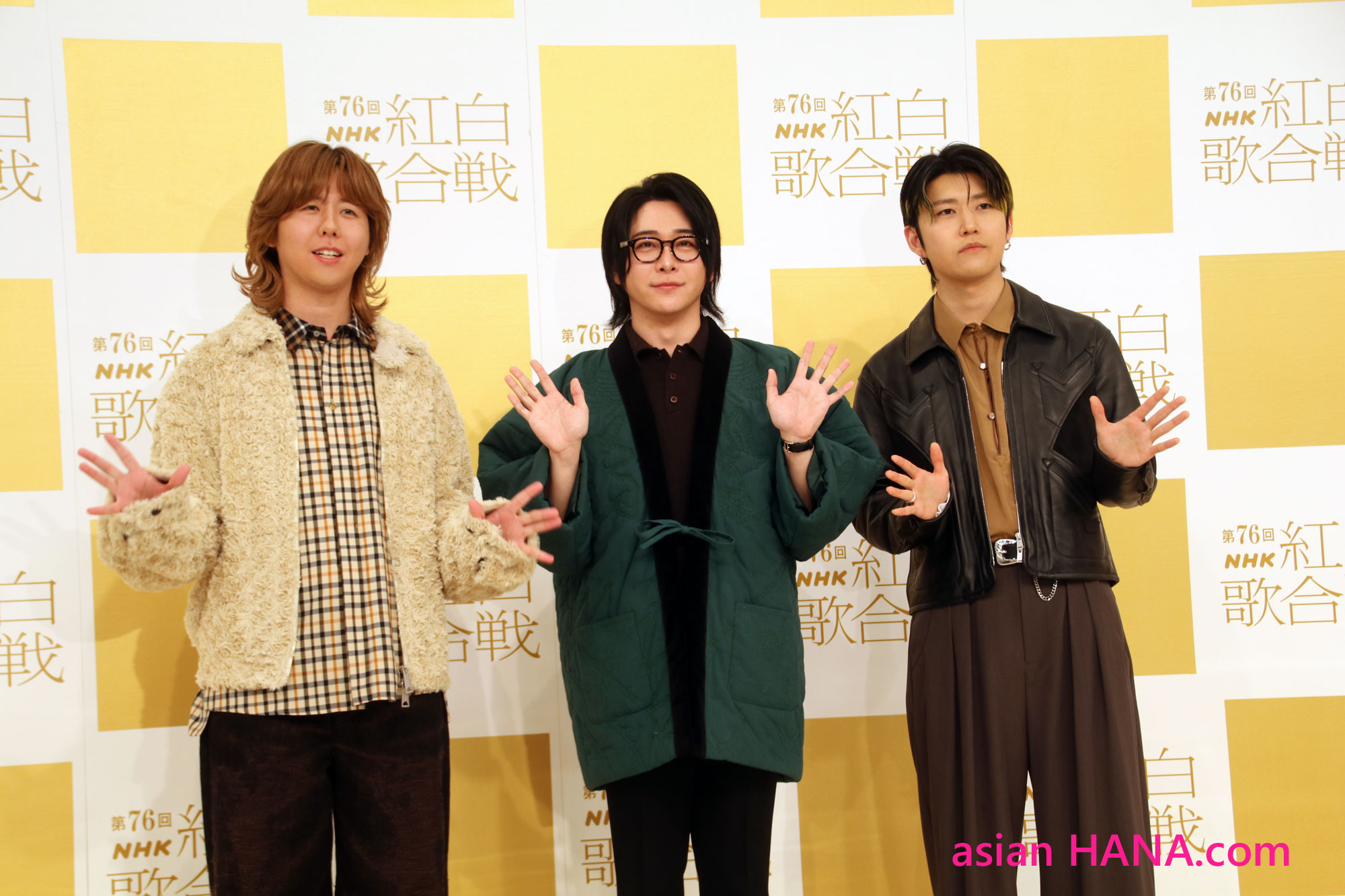 3度目の紅白出場のMrs. GREEN APPLE。意気込みを聞かれると大森元貴より「紅白、大晦日のお祭りですから、楽しみですし心を込めて歌い、演奏をしたいです。」と話しました。大トリを務めることに関して大森「デビュー10周年のタイミングで紅白も100周年が重なって大トリを務める気持に対して光栄です。本当に楽しみたいです」と述べました。紅白の今回の衣装に関しては「すごく上品な装いなので早く着たいなと思ってます」との感想も。今年はどんな年だったのかの質問に関して「去年も本当に充実していて、それ以上はないと思っていたのですが、5大ドームツアーや朝ドラに出たりと初めてづくしでした。まだまだ知らない景色もありました。すごく大変でしたが充実していてワクワクした1年でした」と3人とも実感しておりしみじみと語りました。