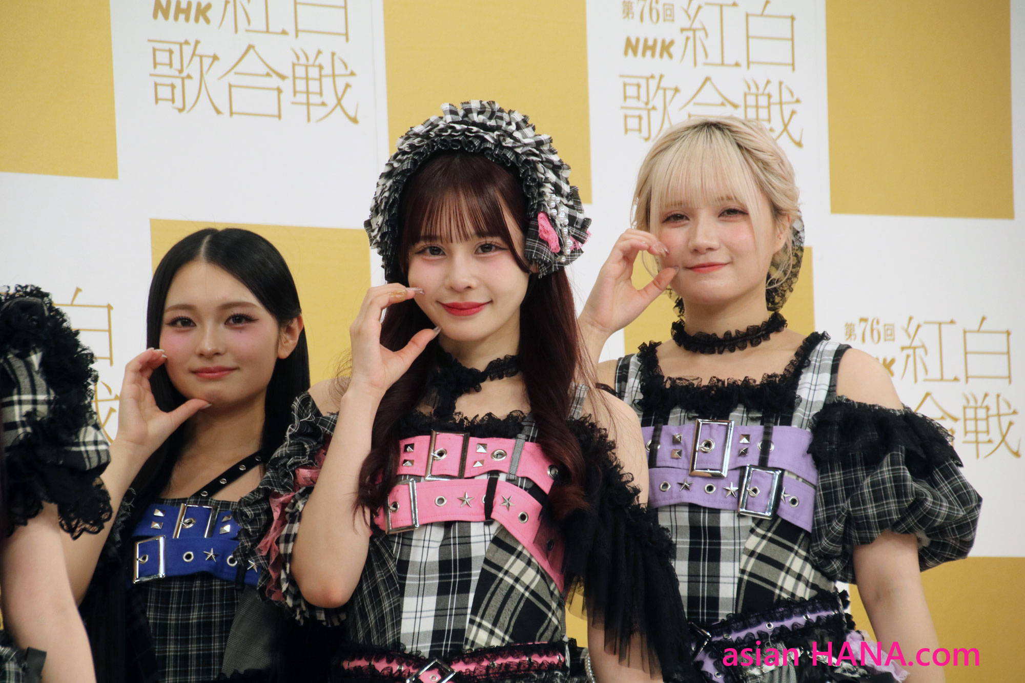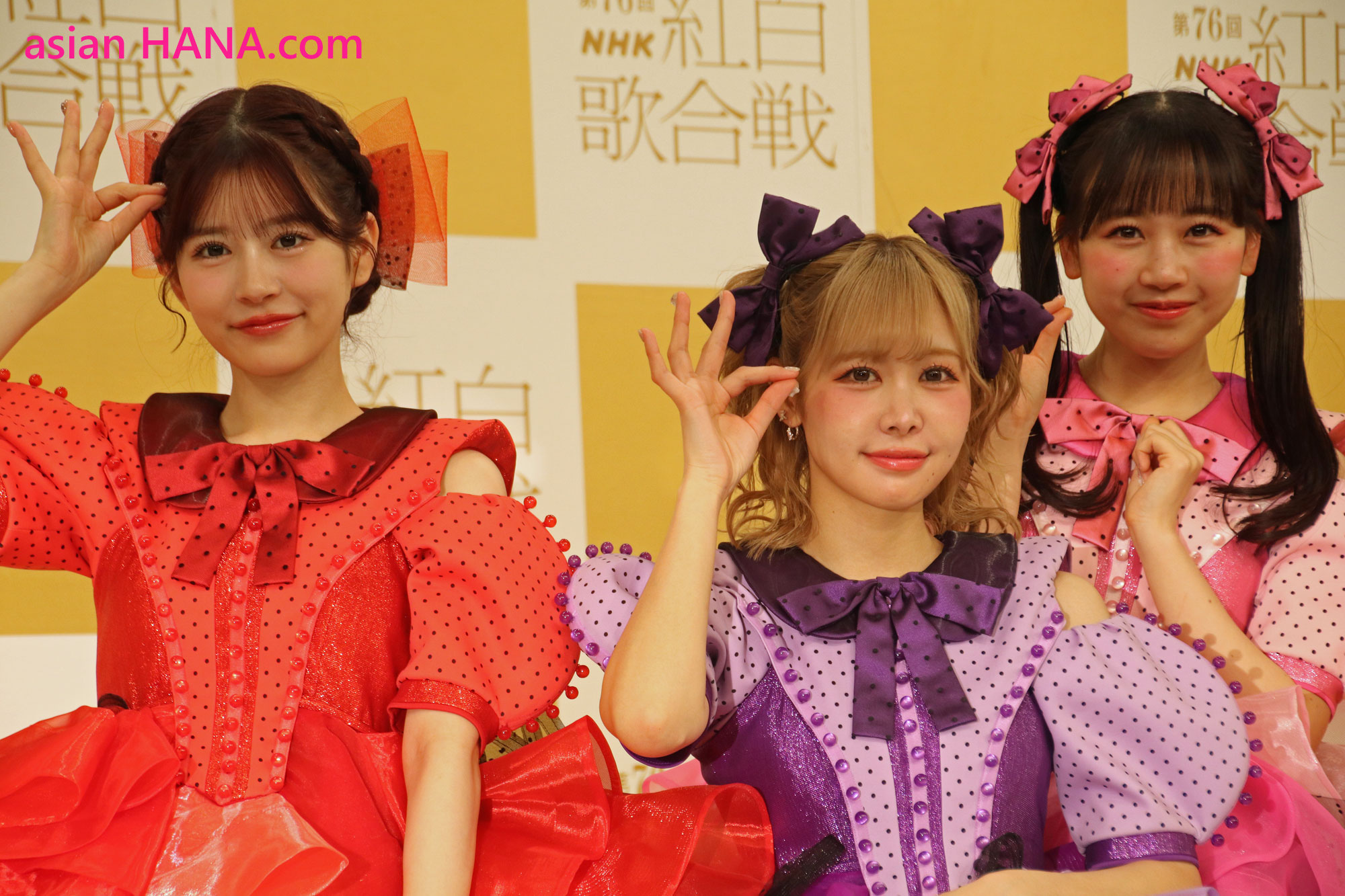 紅白の雰囲気はどうかという問いに対して鎮西寿々歌「まだ実感が湧いていないというのが感想ではありますが、結成当初から紅白に出たいと言い続けていてました。ファンの方も応援してくれて、支えてくれた方にも感謝の気持ちを込めて可愛いを届けたいと思います」