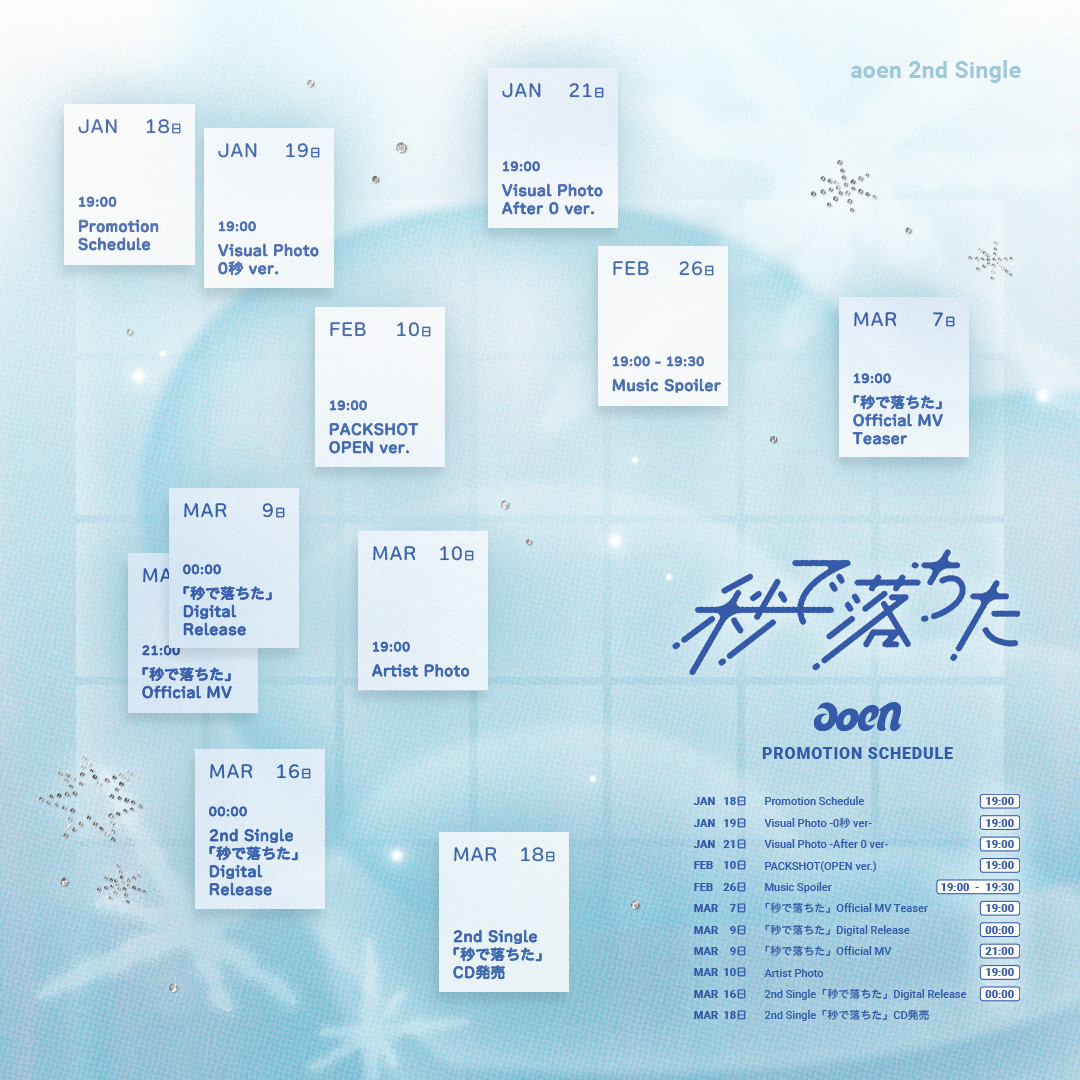 今回公開されたプロモーションスケジュールは、感情が色づき始めた瞬間を思わせる淡い青を基調とし、心が動いた瞬間のときめきが煌めくモチーフで表現されている。1月19日(月)19時には2nd Singleの「Visual Photo -0秒 ver.-」の公開、1月21日(火)19時には「Visual Photo -After 0 ver.」の公開を控えている。青春を体現してきたaoenがいったいどんな姿をみせるのか期待が高まる。さらに、3月9日(月)にはタイトル曲「秒で落ちた」のデジタルリリースおよびOfficial MVが先行公開されることが明らかとなった。