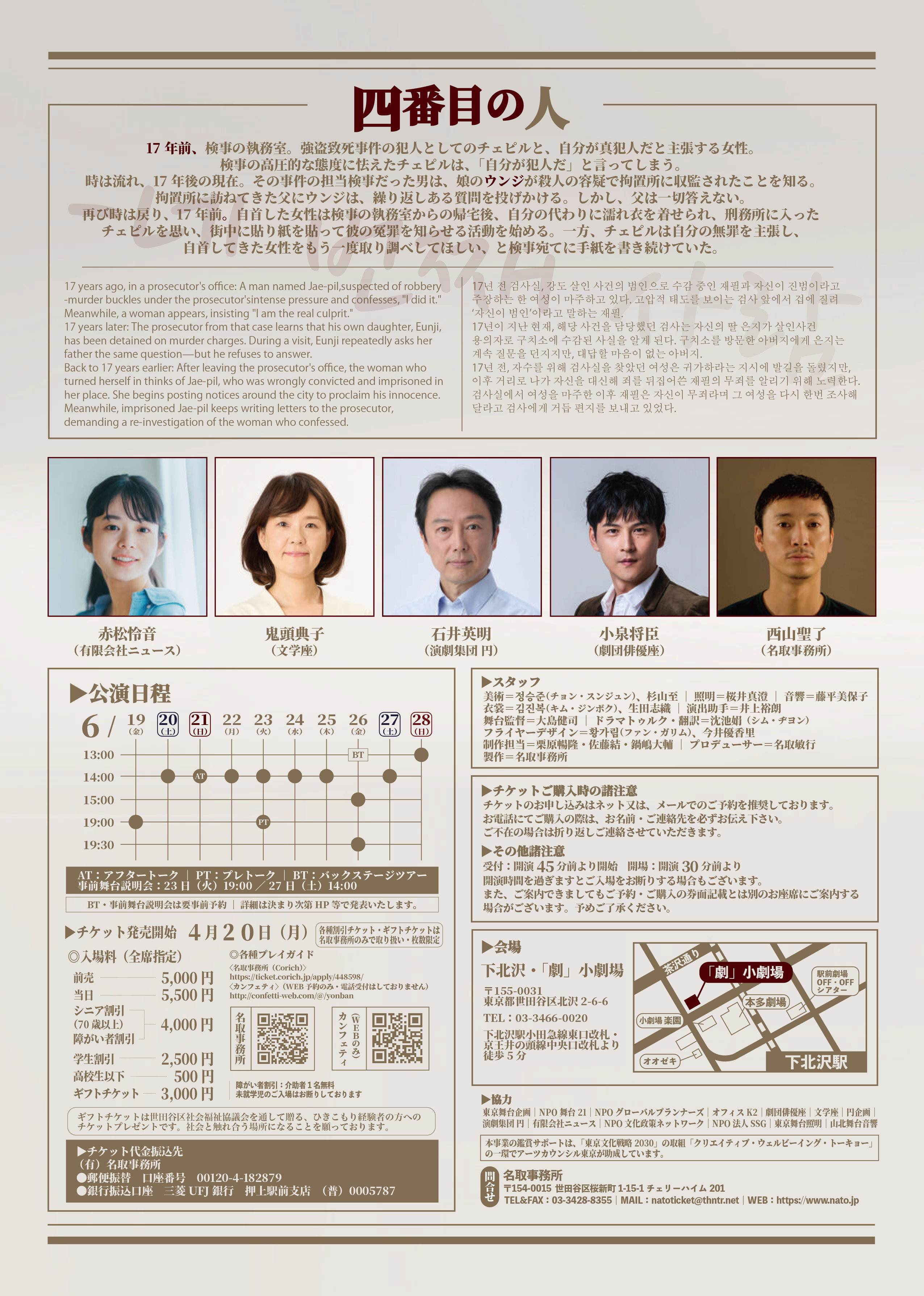 名取事務所主催、名取事務所・普遍的劇団 共同制作『四番目の人』が2026年6月19日 (金) 〜 6月28日 (日)に下北沢「劇」小劇場 (東京都世田谷区北沢 2-6-6)にて上演されます。 チケットはカンフェティ(運営:ロングランプランニング株式会社、東京都新宿区、代表取締役:榑松 大剛)にて発売中です。