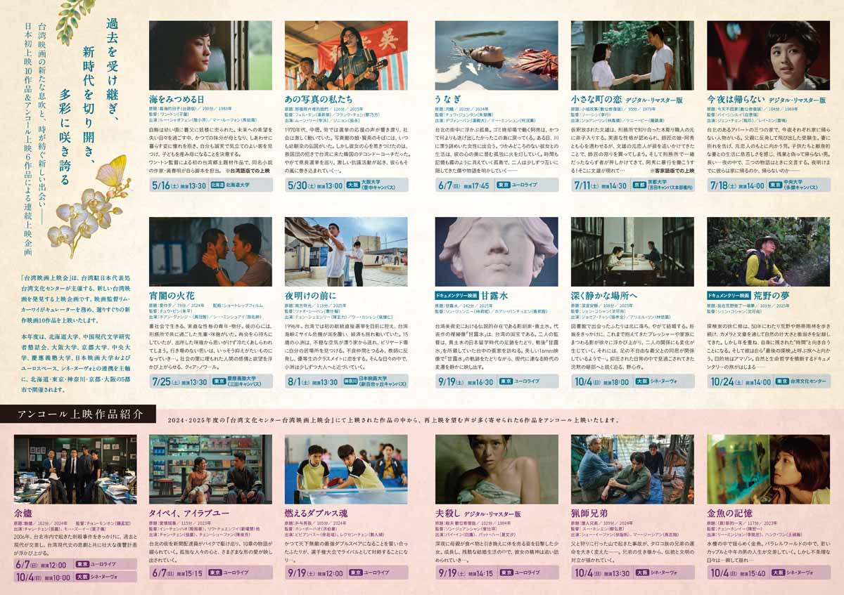 2026年度は、北海道大学中国文化論研究室及び中国現代文学研究者懇話会、大阪大学大学院人文学研究科、京都大学大学院人間・環境学研究科東アジア文明講座、中央大学文学部中国言語文化研究室、慶應義塾大学東アジア研究所、日本映画大学国際交流センターの6校の大学と、ユーロスペース(会場:ユーロライブ)、シネ・ヌーヴォの2つのミニシアターのご協力を得て、台湾文化センターを含め全9会場にて開催いたします。ユーロライブ、シネ・ヌーヴォでは、新作およびアンコール上映をお楽しみいただけます。