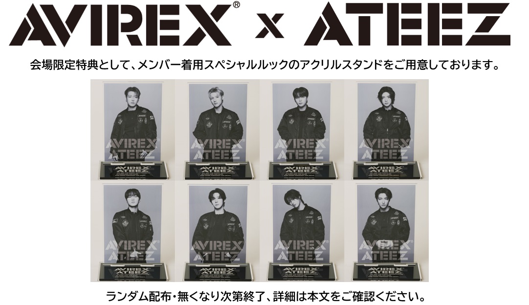 今回のLIMITED STOREでは、AVIREXの象徴的なアイテムであるフライトジャケットやスウェット、Tシャツなどに、ATEEZのエネルギッシュな魅力を融合させたコレクションを展開。会場限定特典として、コラボレーションアイテムをメンバーが着用したスペシャルルックのアクリルスタンドをご用意しています。