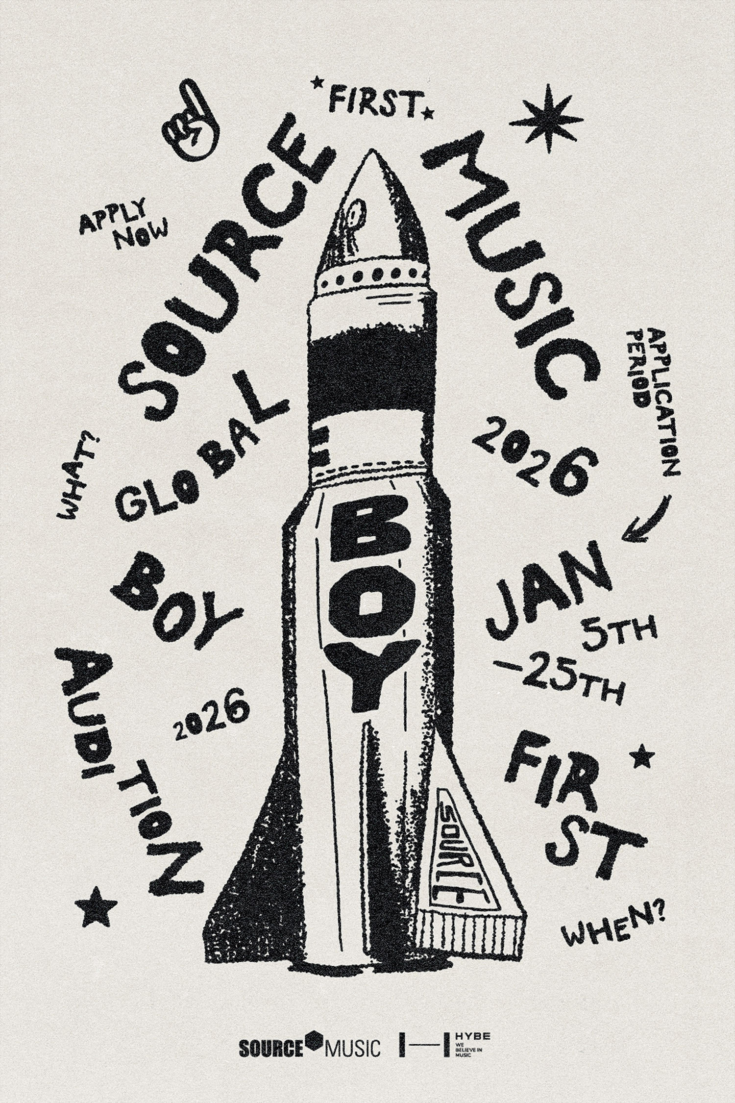 オーディション公式サイトおよびSNSに公開されたポスターには、オーディション情報を載せた宇宙船が登場し、注目を集めています。これはSOURCE MUSIC初となるボーイグループオーディションを、人類初の宇宙船打ち上げになぞらえて表現したものです。文字とグラフィックの自由な配置は、SOURCE MUSICが目指す「10代の個性と自律性」を直感的に表現しています。