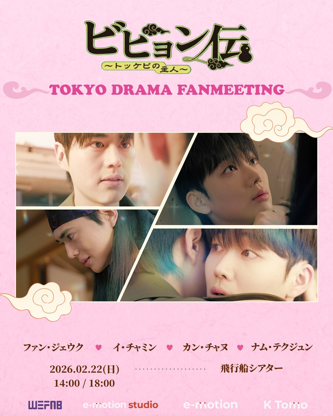 韓国俳優ファン·ジェウク、イ·チャミン、ナム·テクジュン、カン·チャヌが2026年2月22日(日) に東京・飛行船シアター にてファンミーティング「ビヒョン伝~トッケビの主人~ TOKYO DRAMA FANMEETING」を開催する。