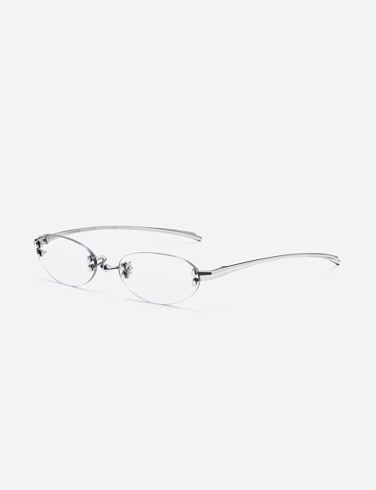 2025 BOLDコレクションとして発売された「FURI-02」は、シルバーメタル素材のオーバルシェイプのメガネに、ブリッジに加えられたシグネチャーBOLDシンボルが特徴です。