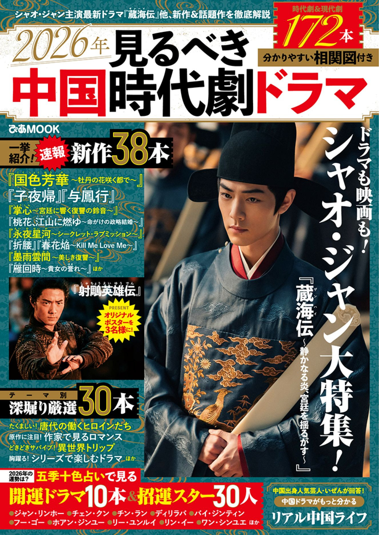 国宝級スターのシャオ・ジャンが表紙を飾り、最新&注目の中国ドラマの話題作をチェックできるぴあMOOKシリーズ最新刊第6弾「2026年⾒るべき中国時代劇ドラマ」を、いよいよ本日2026年2月24日(火)に発売いたします。 待望の最新刊は、新作ドラマ「蔵海<ザンハイ>伝〜静かなる炎、宮廷を揺るがす〜」、新作映画『射鵰英雄伝』で注目を浴びるシャオ・ジャンの大特集をはじめ、新作や話題作を中心に日本で楽しめる中国時代劇と現代ドラマを170作品以上を紹介。複雑に絡み合う人間関係やストーリーをしっかり補足したい中国ドラマ好きから、中華エンタメの注目トレンドをキャッチしたい方までが楽しめガイドブックです。
